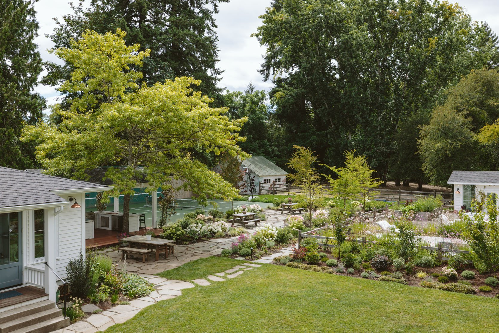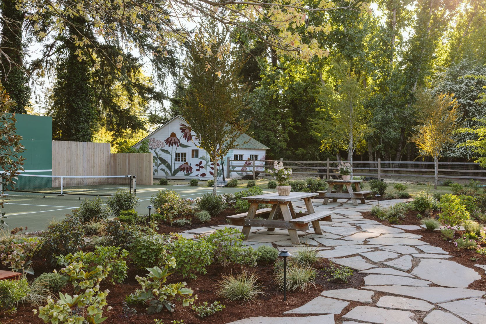 Here you can see how the whole yard works – the stone pathways with the picnic tables surrounded by all the greenery (designed to be full but not grow too high) and with the trees that will eventually create shade for the seating areas.