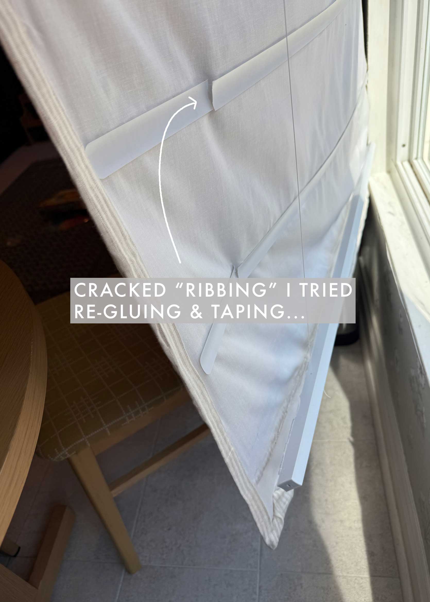 Seeing those numbers, I hunted around for a “hack” and found this cordless mini blind project. It was easy, cheap, and impressive. But what I didn’t factor in was that my kitchen windows are south-facing, and they get absolutely blasted by afternoon sun. Strong sun + plastic + fabric glue = Bad news.