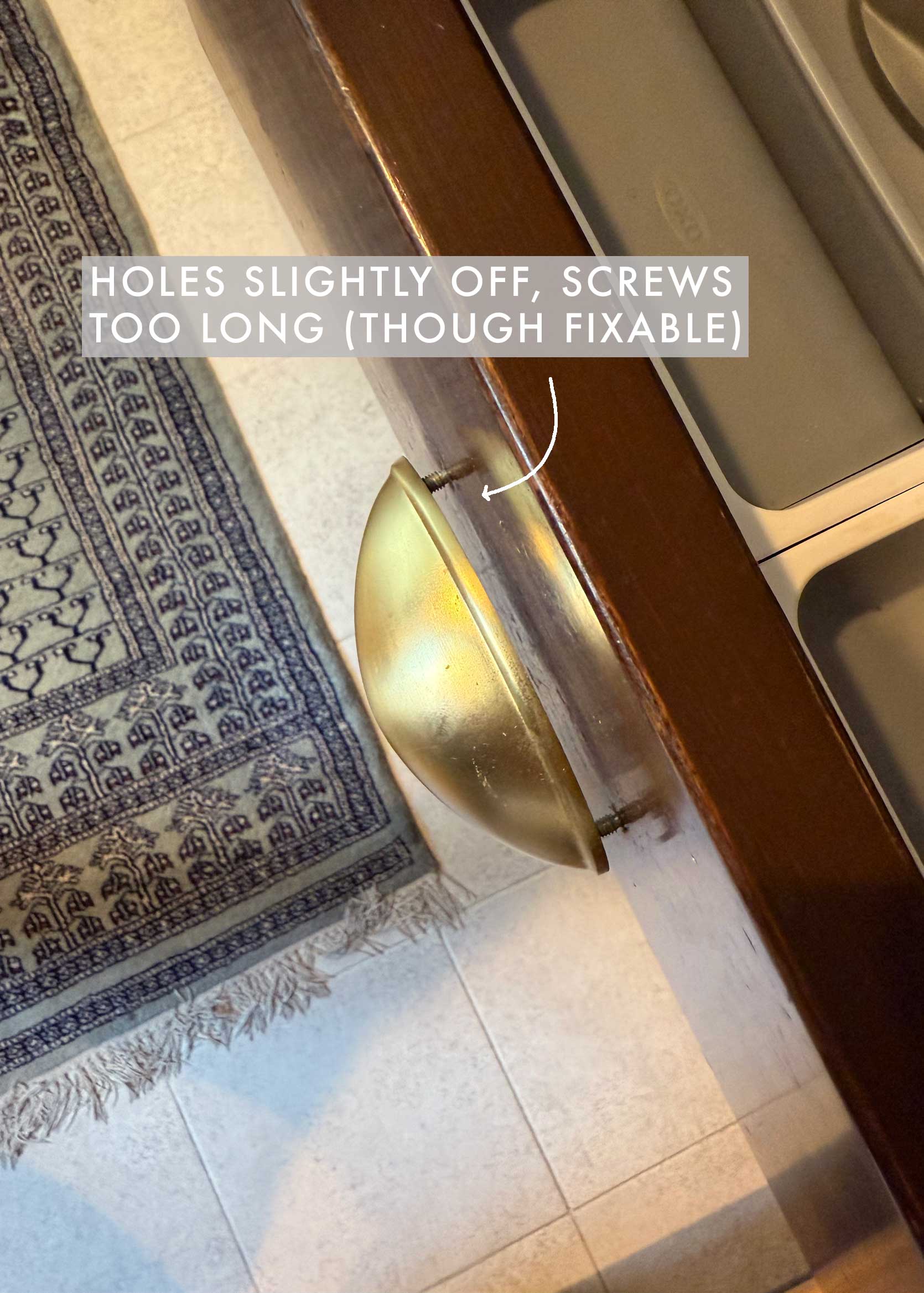 And the hardware was acquired very cheaply during a Prime Day from Amazon, when I still regularly shopped there. What they don’t tell you about very cheap hardware is that the measurements might be just slightly off. A knob is no big deal, but if a pull is even a few millimeters off, it will be very difficult to install or keep in place. I pushed forward anyway, not to mention, the screws were too long, and I didn’t bother to just get smaller screws or even nuts for the backs to keep them in place. Every time I open my drawers (which take some pressure because they are soft-close), the handle pulls out about half an inch, and I have to push it back in place. It’s fun times over here in Casa Hernandez.