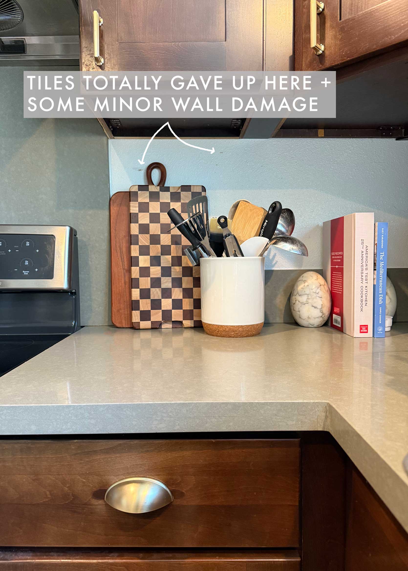 You know those things in your house that you’ve gone blind to? That you forget are the way that they are until someone new comes over and then suddenly you see EVERYTHING, panic, feel embarassed…all the things? That is my plastic kitchen backsplash. It was peeling off so badly on some stretches of wall that I just took it off. On the other side, only a piece or two are missing or kind of sadly just hanging limply off the wall. It’s so bad.