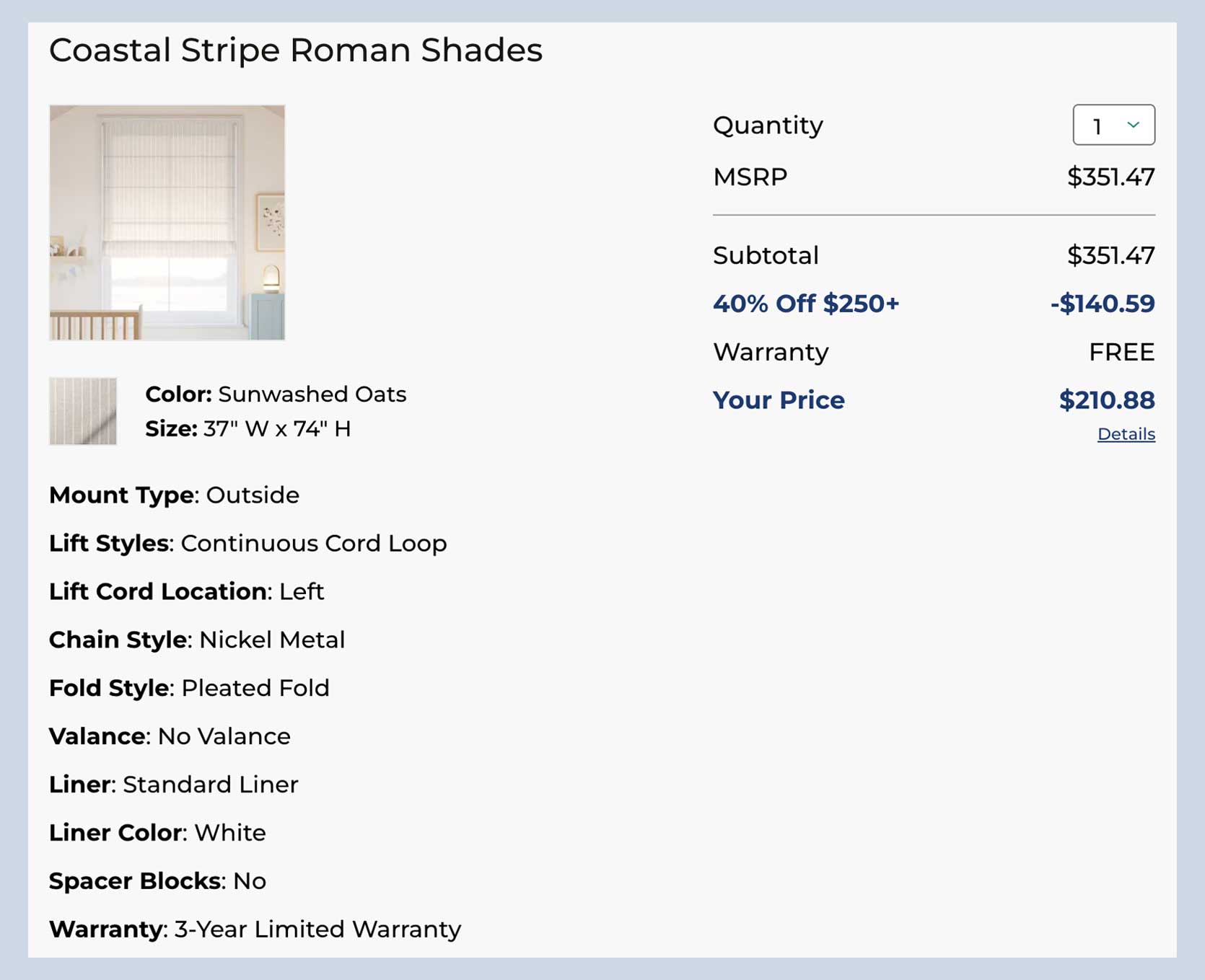 I’ve since considered just buying some Roman shades from Select Blinds, whom I used for a shade for my daughter’s room, and was happy with. Having my $600 custom sewing quote in mind (in addition to the cost of fabric), I explored what it would cost to buy direct from a store.
