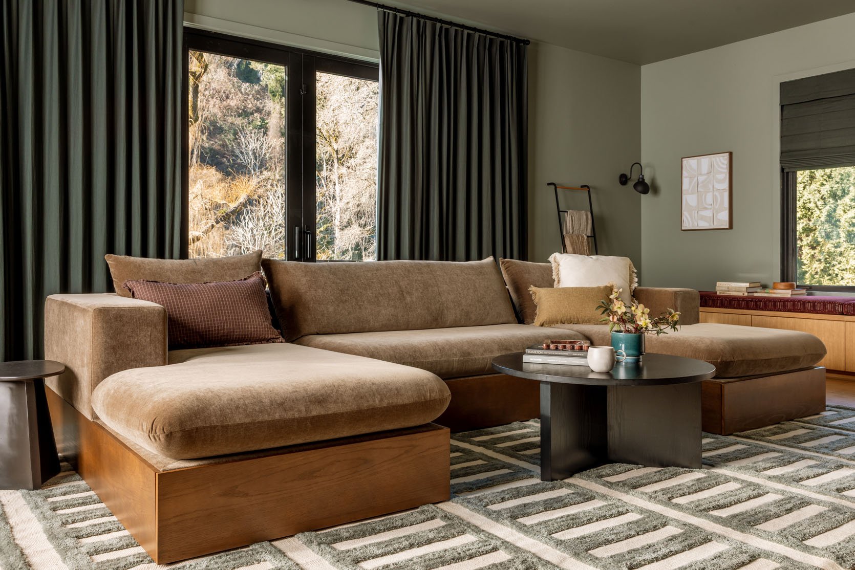 The new redesigned Bennett arrived last week (I flew down and approved the sample in person a month ago), and we JUST shot it at my brother’s house. It’s awesome. So comfortable, chunky, solid with fantastic proportions. This one is the most expensive, but you basically don’t need any other piece of furniture in your TV room – it’s massive! We are still selling the new version of the Bennett in this pretty “cub” velvet, a really soft green linen blend (great for kids and dog hair – that’s what my brother got!), and a blue velvet. Here is what the new one looks like: