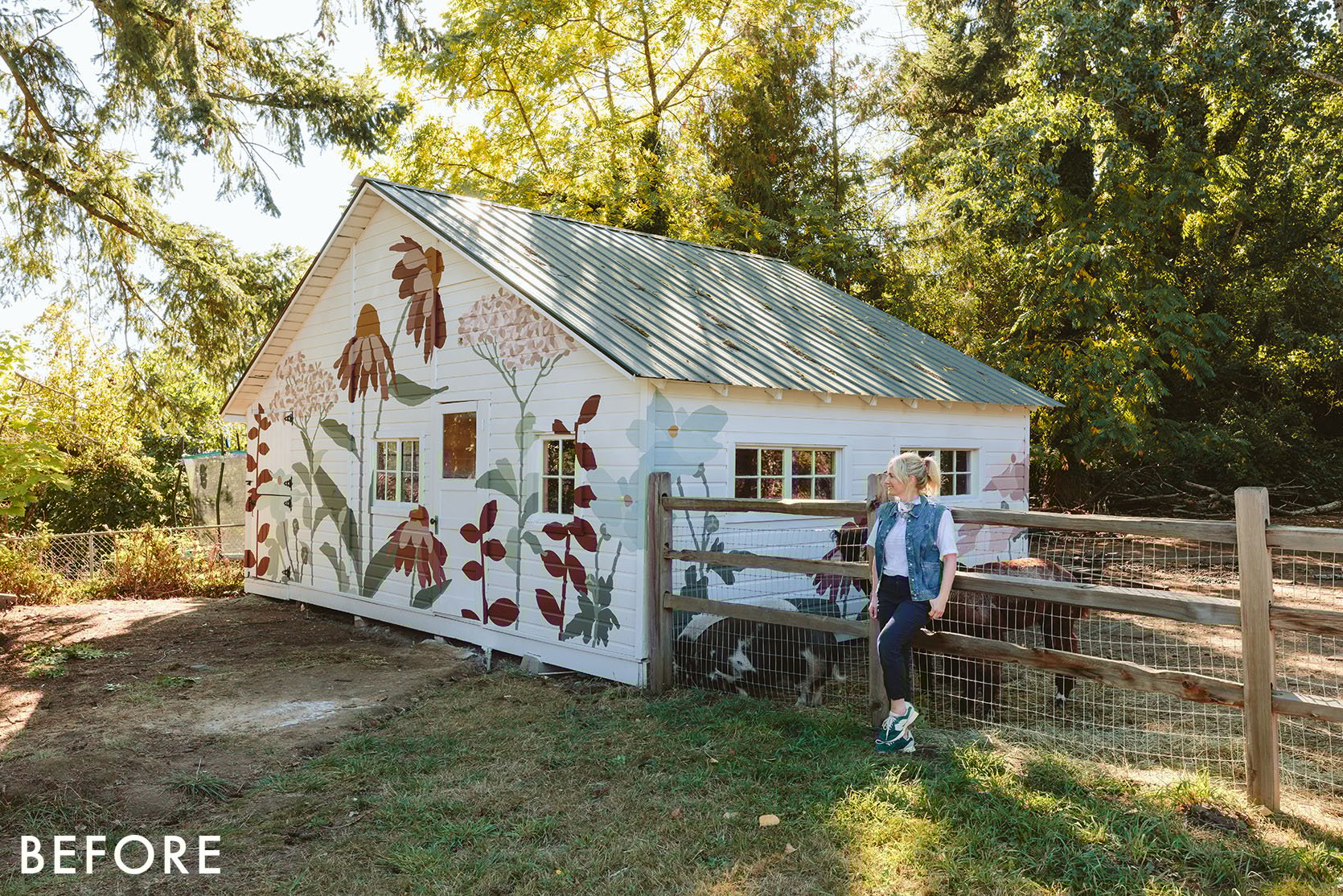 Every winter it was green, wild, and full of weeds (which we didn’t mind, TBH), and every summer it was so dry and ugly (which we did mind). But this area is more utility – it’s where Brian wheelbarrows the food to the animals, and kids stand on the fence to feed the animals. It didn’t need to be pretty, just better than it was.