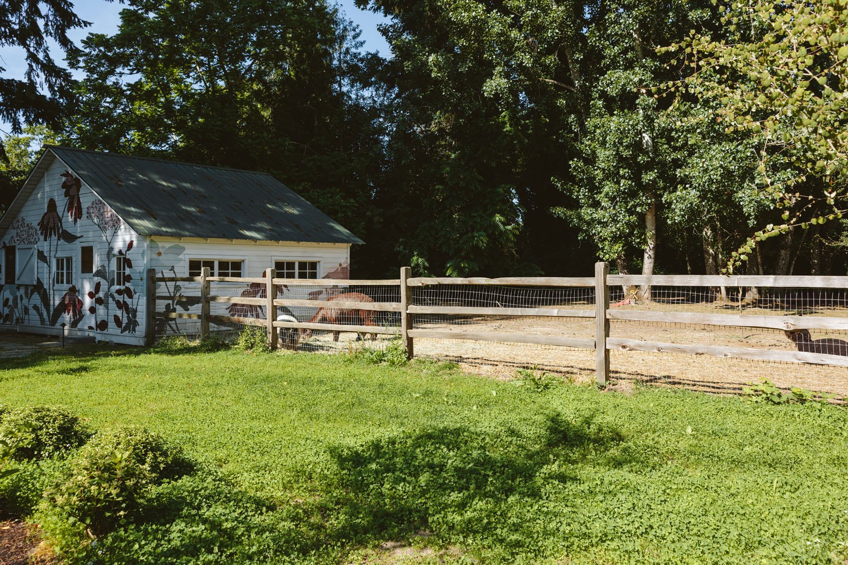 I couldn’t be happier. BIG FAN. In some places, it’s taller? Other places it’s more like ground cover. I love how it looks soft and natural, bright green, and easy. Imperfect, wild, but not out of control, and just so appropriate for our space. It is taking over the boxwood a bit, which we can’t tell if we care about (we put in those shrubs after the clover as a ball barrier), so we might carve out a moat around those plants with mulch. Easy fix. All in all, we love it. Now, if we could just plant it in that brown paddock, without the alpacas and pigs eating it before it could grow (which would never happen – such pigs!).